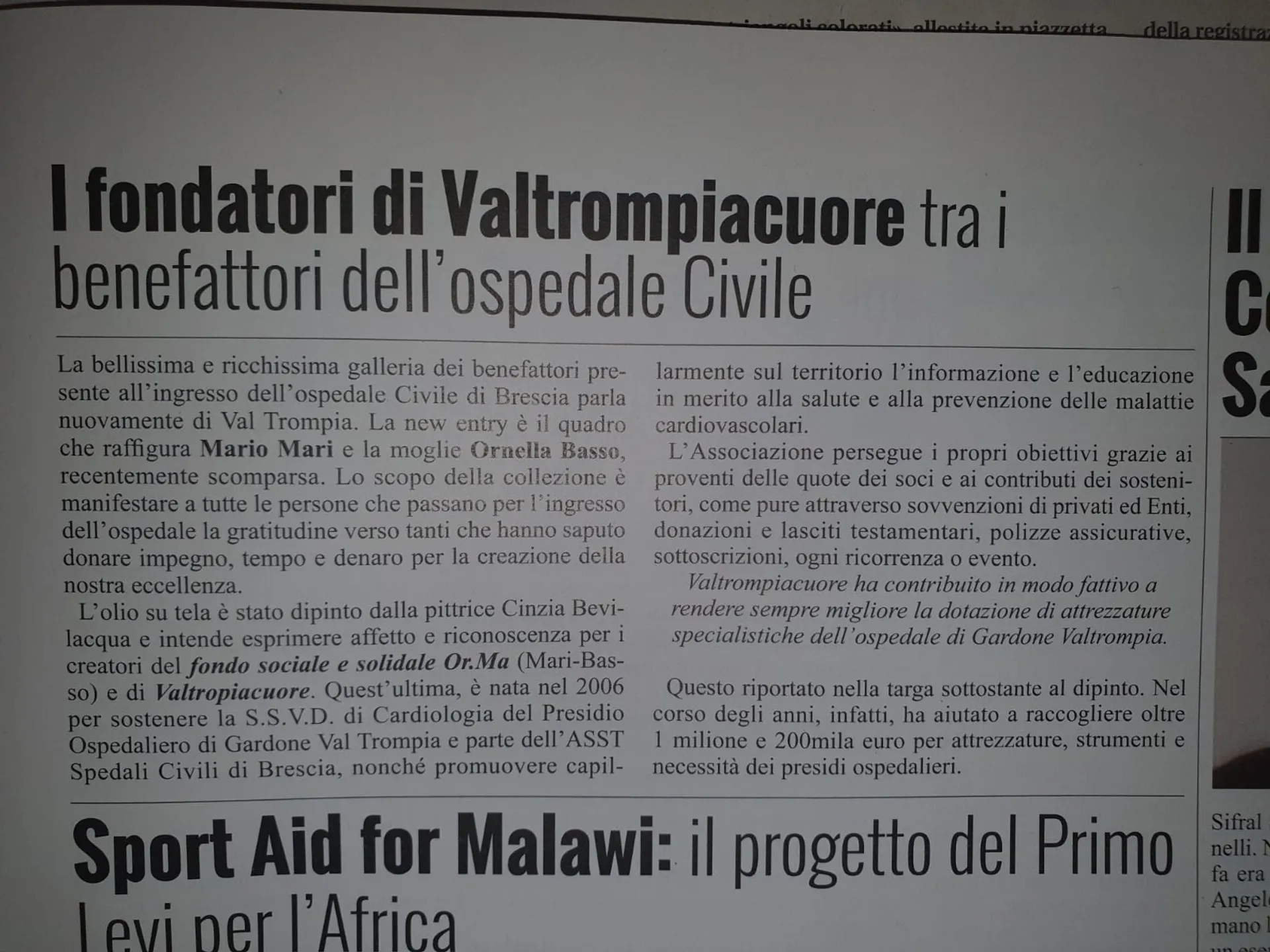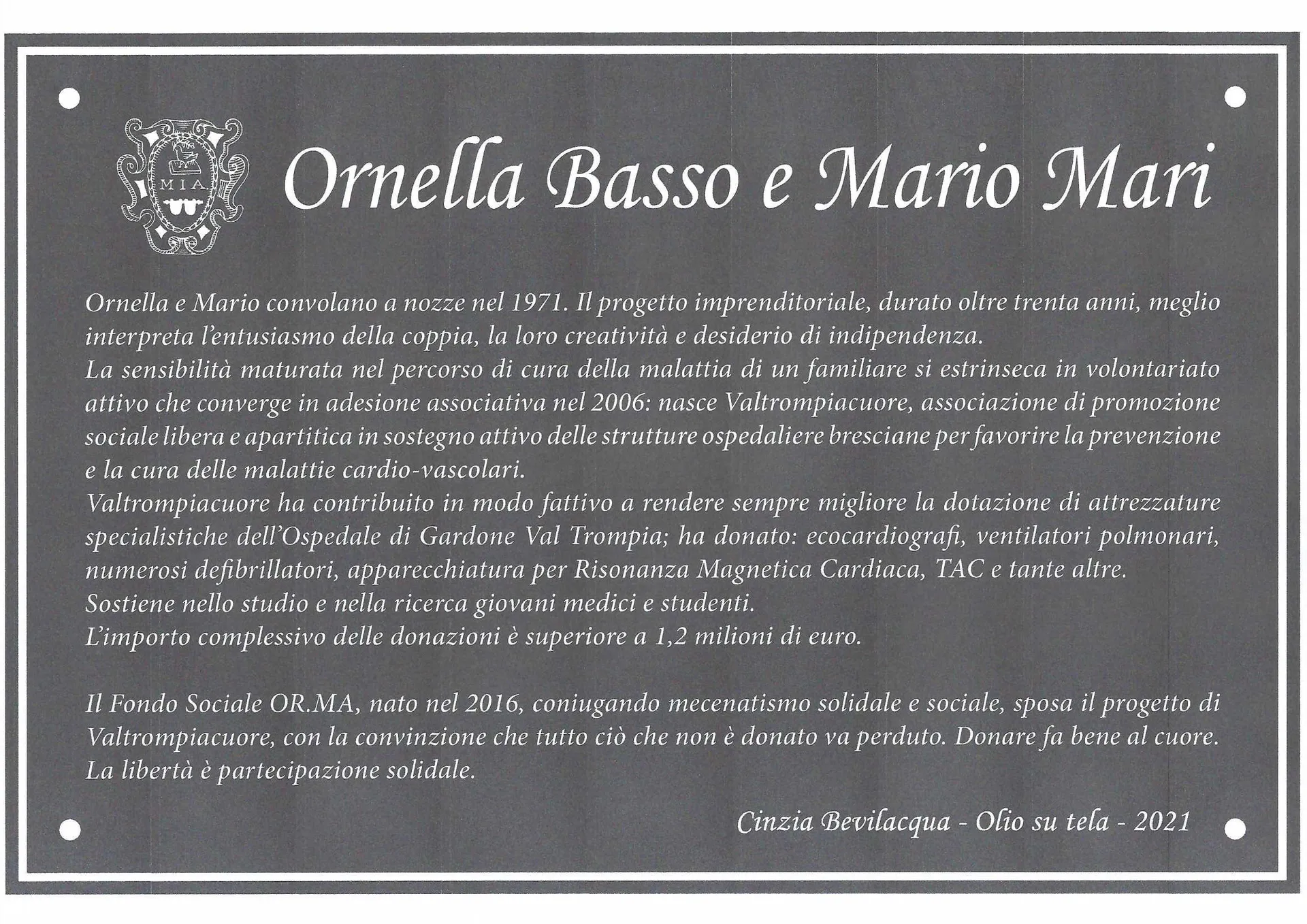 Da oggi due nuovi volti accoglieranno i bresciani che si recano al Civile: nella Galleria dei Quadri che ritraggono alcuni dei principali benefattori dell’Ospedale, compaiono anche Mario Mari e Ornella Mari-Basso, marito e moglie, fondatori della Associazione Valtrompiacuore e del Fondo Sociale Solidale OR.MA Mari-Basso.