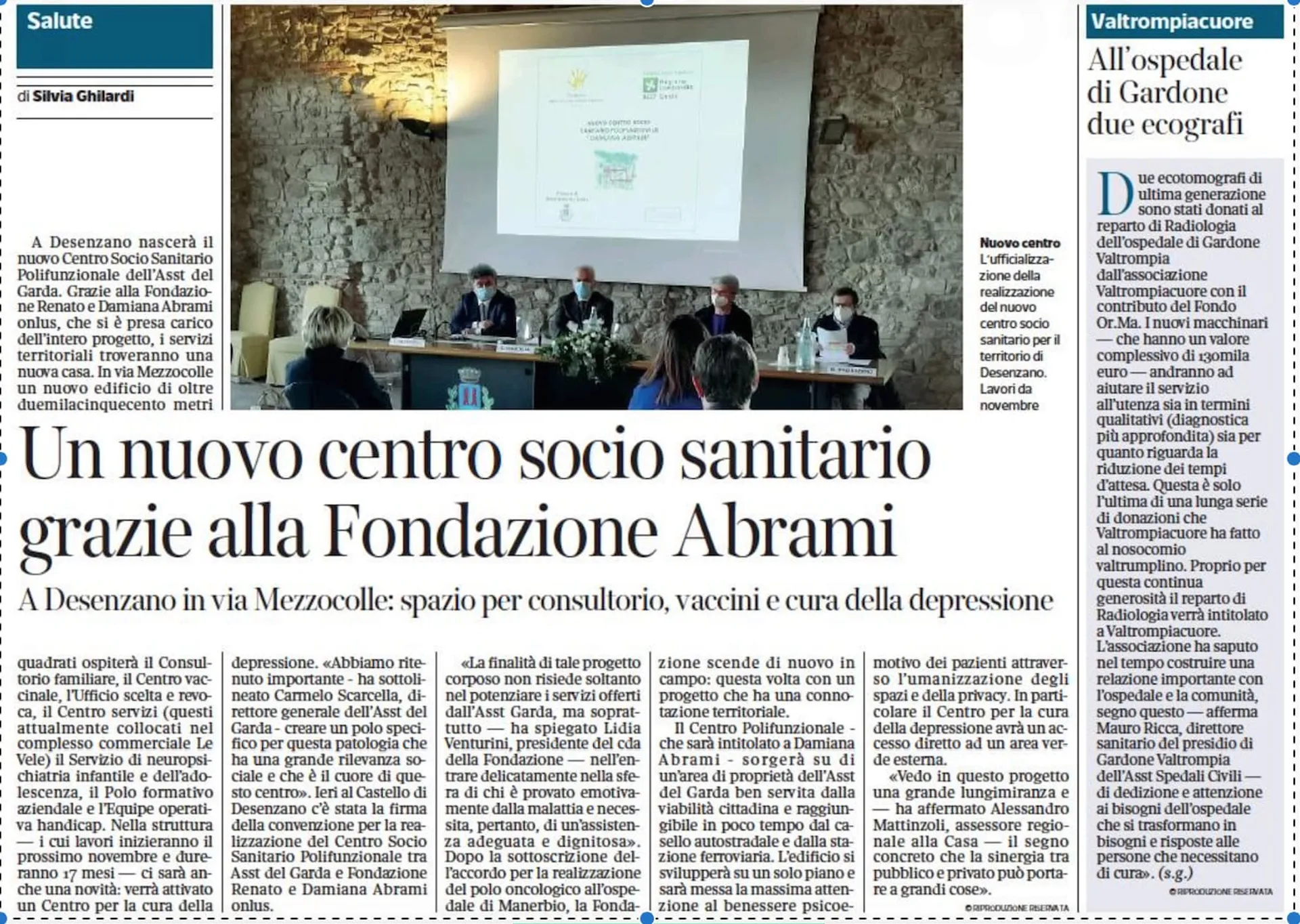 Donazione, con l’aiuto dei fondi OR.MA Fondo Solidale Sociale famiglia Mari-Basso e Mari Pierluigi Fondo di Solidarietà Sociale, di 2 Ecotomografi al Reparto di Radiologia del Presidio Ospedaliero di Gardone Val Trompia, grazie a questa donazione il Reparto è stato intitolato a VALTROMPIACUORE.