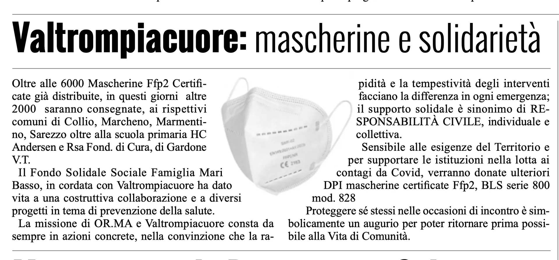 Oltre alle 6000 Mascherine Ffp2 Certificate già distribuite, ne abbiamo consegnate altre 2000, ai rispettivi comuni di Collio, Marcheno, Marmentino, Sarezzo oltre alla scuola primaria HC Andersen e Rsa Fond. di Cura, di Gardone V.T. Proteggere sé stessi nelle occasioni di incontro è simbolicamente un augurio per poter ritornare prima possibile alla Vita di Comunità. Il Fondo Solidale Sociale Famiglia Mari Basso, in cordata con Valtrompiacuore ha dato vita a una costruttiva collaborazione e a diversi progetti in tema di prevenzione della salute. La missione di OR.MA e Valtrompiacuore consta da sempre in azioni concrete, nella convinzione che la rapidità e la tempestività degli interventi facciano la differenza in ogni emergenza; il supporto solidale è sinonimo di RESPONSABILITÀ CIVILE, individuale e collettiva.