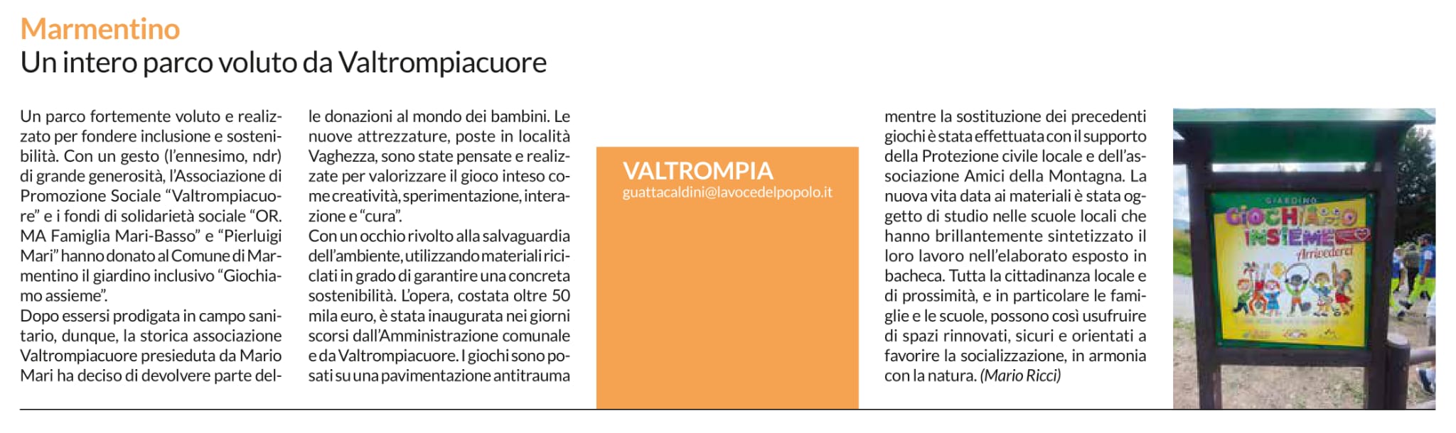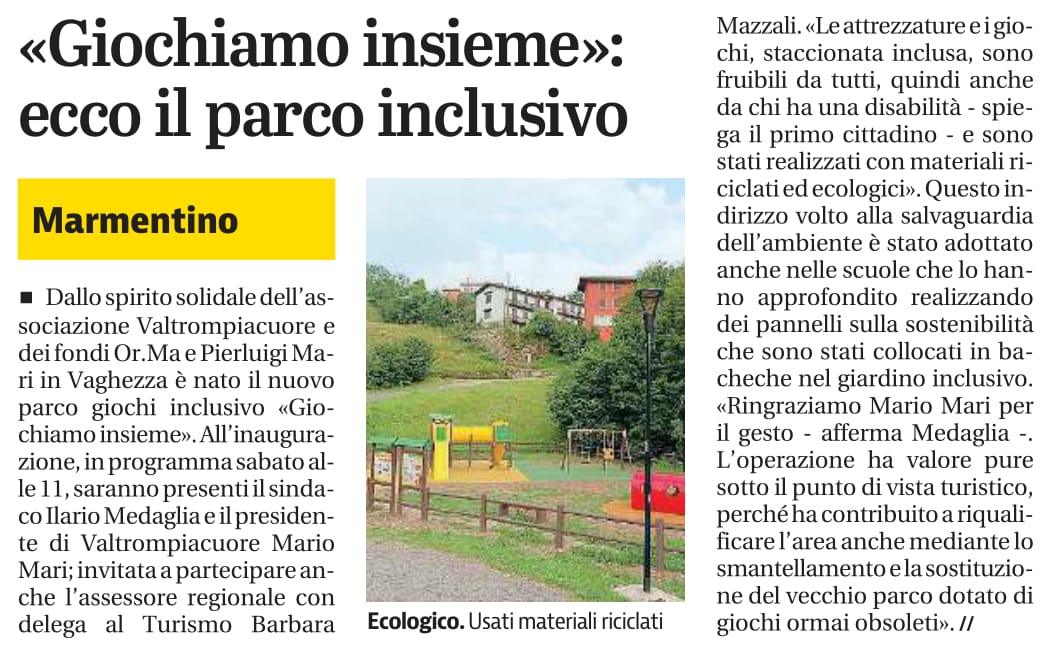 “Valtrompiacuore” per i bambini “Giochiamo Insieme” in località Vaghezza di Marmentino (Brescia) è un cantiere valoriale dalle mille aspirazioni. Inclusività, natura, sostenibilità, socialità, rispetto, prossimità, turismo, diritti dei bambini, galateo per piccoli e grandi, uno spazio per tutti.