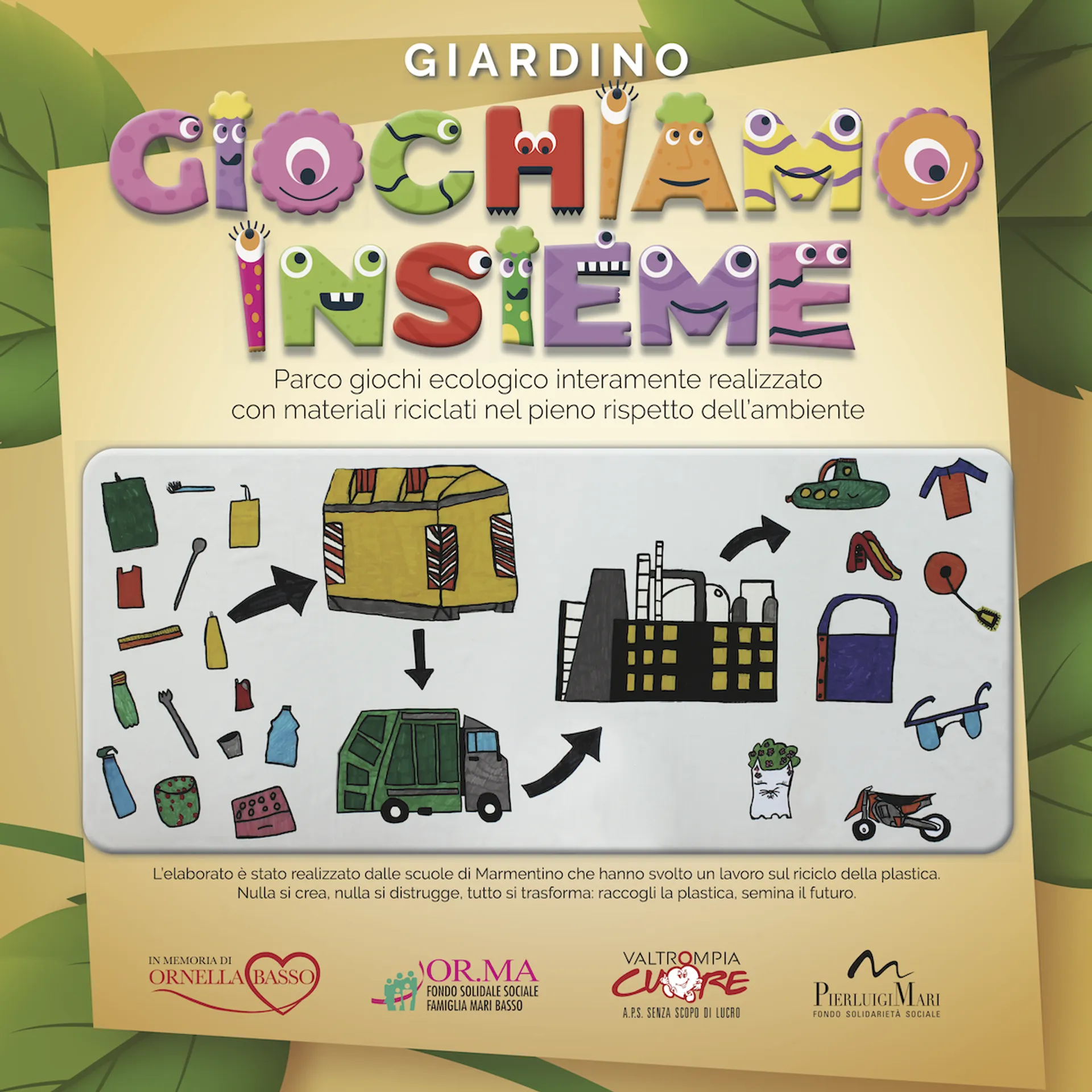 Le nuove attrezzature sono realizzate con materiali riciclati e la nuova vita data allo “scarto” è stata oggetto di studio per i bambini, i docenti, i genitori delle scuole dell’infanzia e primaria di Marmentino.