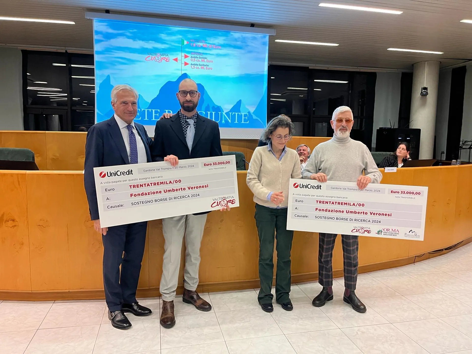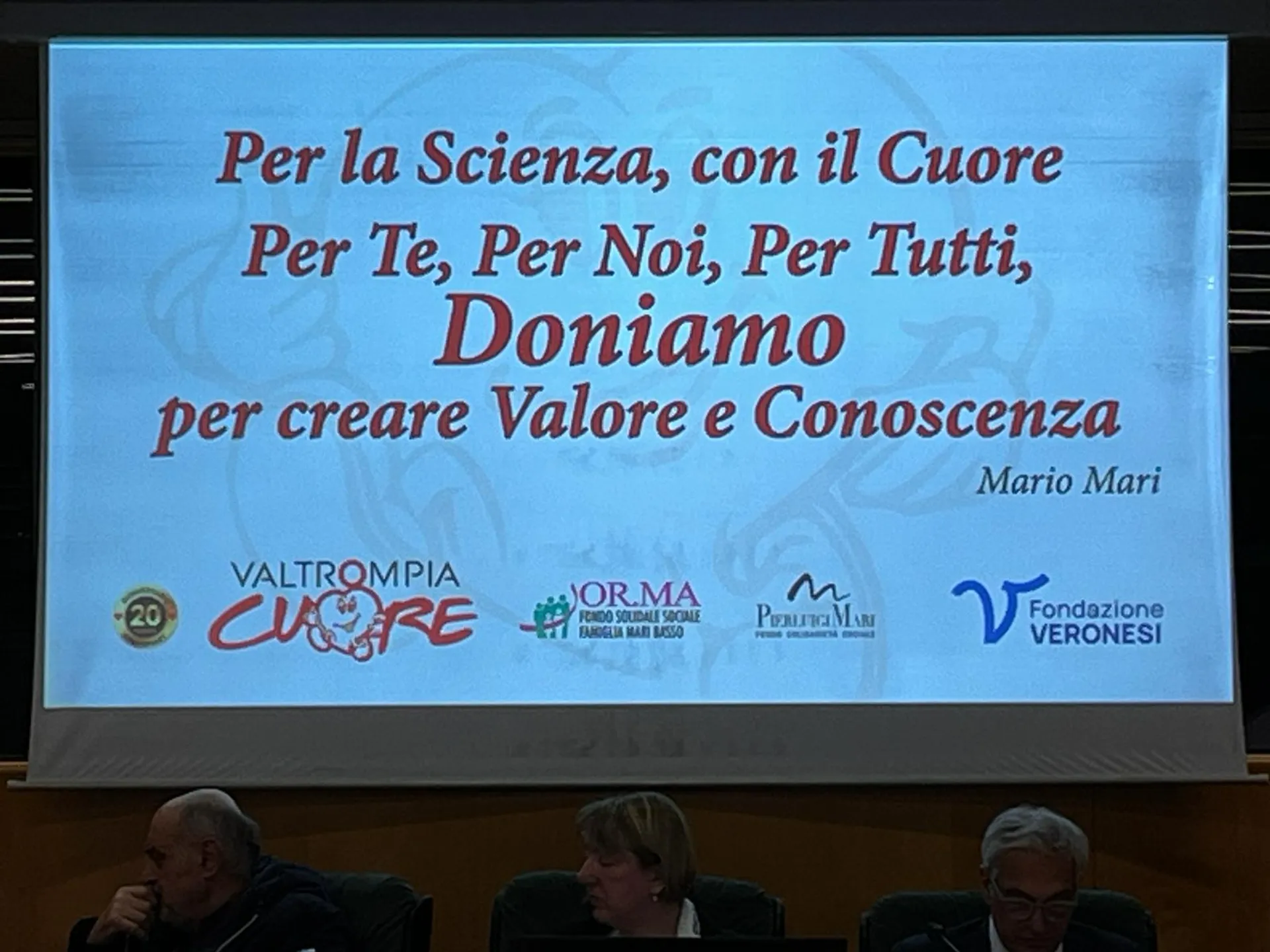 Sostenuta dai fondi sociali OR.MA Famiglia Mari Basso e Pierluigi Mari , Valtrompiacuore ha così raccolto e offerto due borse di studio, valore totale, “66mila euro” “Carcinoma ovarico” è la sfida ancora aperta per Il dottore Davide Capoferri del Dipartimento di Medicina Molecolare e Traslazionale, Università degli Studi di Brescia; “Biodisponibilità di antocianine vegetali per contrastare la cardiotossicità del chemioterapico” è l’ambito di ricerca della Dottoressa Alessandra Marinelli, Università degli Studi di Milano. Il programma di ricerca scientifica è stato oggetto del Convegno “Ricerca scientifica a servizio dell’umanità: prevenzione, diagnosi e cura”, patrocinato da Comunità Montana di Valle Trompia, rappresentata da Gian Maria Giraudini, ospiti il Professor Paolo Veronesi di Fondazione Umberto Veronesi e i Dirigenti dei reparti di Cardiologia e Radiologia del P.O. territoriale, Dottor Nicola Pagnoni e Dottoressa Maria Rosa Cristinelli.