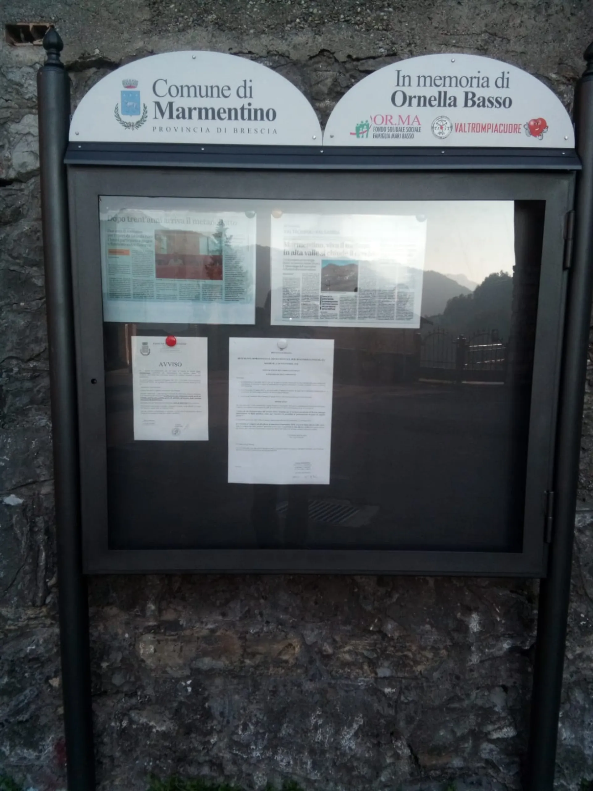 Contribuito con OR.MA Fondo Solidale Sociale Famiglia Mari Basso all’allestimento di 3 bacheche municipali, per varie comunicazioni, nel territorio comunale di Marmentino e Lodrino (in memoria di Ornella Basso).