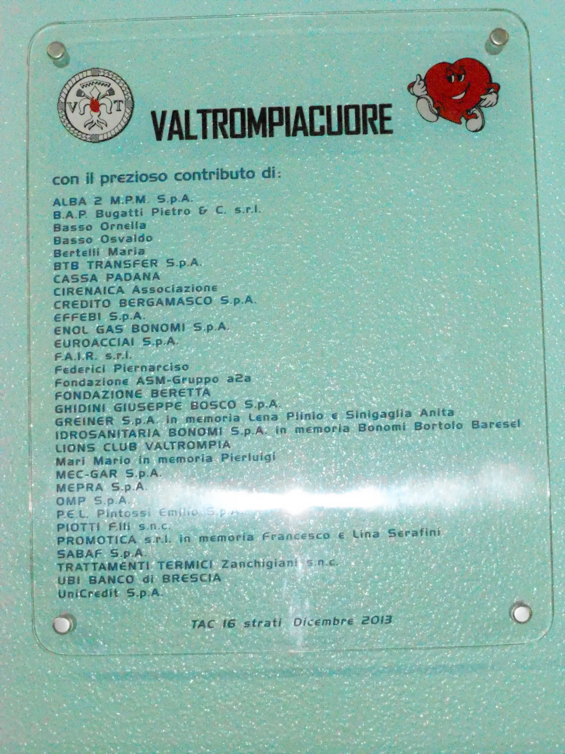 Sabato 11 gennaio 2014 presso la sala dʼattesa della Radiologia del Presidio di Gardone Val Trompia si è tenuta l’inaugurazione della TAC 16 strati donata al servizio dell' ospedale triumplino. Il macchinario è stato donato da molteplici donatori, in primis, dall' associazione Valtrompiacuore che si è resa anche promotore della sensibilizzazione e della raccolta di fondi che ha reso possibile l' acquisizione. Un grazie anche ai benefattori valgobbini, valtrumplini e al contributo dei circa 900 nostri sostenitori. Presenti all' evento: Ezio Belleri, Commissario Straordinario Azienda Ospedaliera Spedali Civili di Brescia; Ermanna Derelli, Direttore Sanitario Aziendale A.O. Spedali Civili di Brescia; Primo Fogassi, Direttore Amministrativo Aziendale A.O. Spedali Civili di Brescia; Mario Mari, Presidente Associazione Valtrompiacuore; Aristide Peli, Assessore Provincia di Brescia; Bruno Bettinsoli, Presidente Comunità Montana e altre autorità civili e militari. Al termine della Cerimonia il Cardinale Giovanni Battista Re ha impartito la benedizione alla sala diagnostica e all’apparecchiatura.