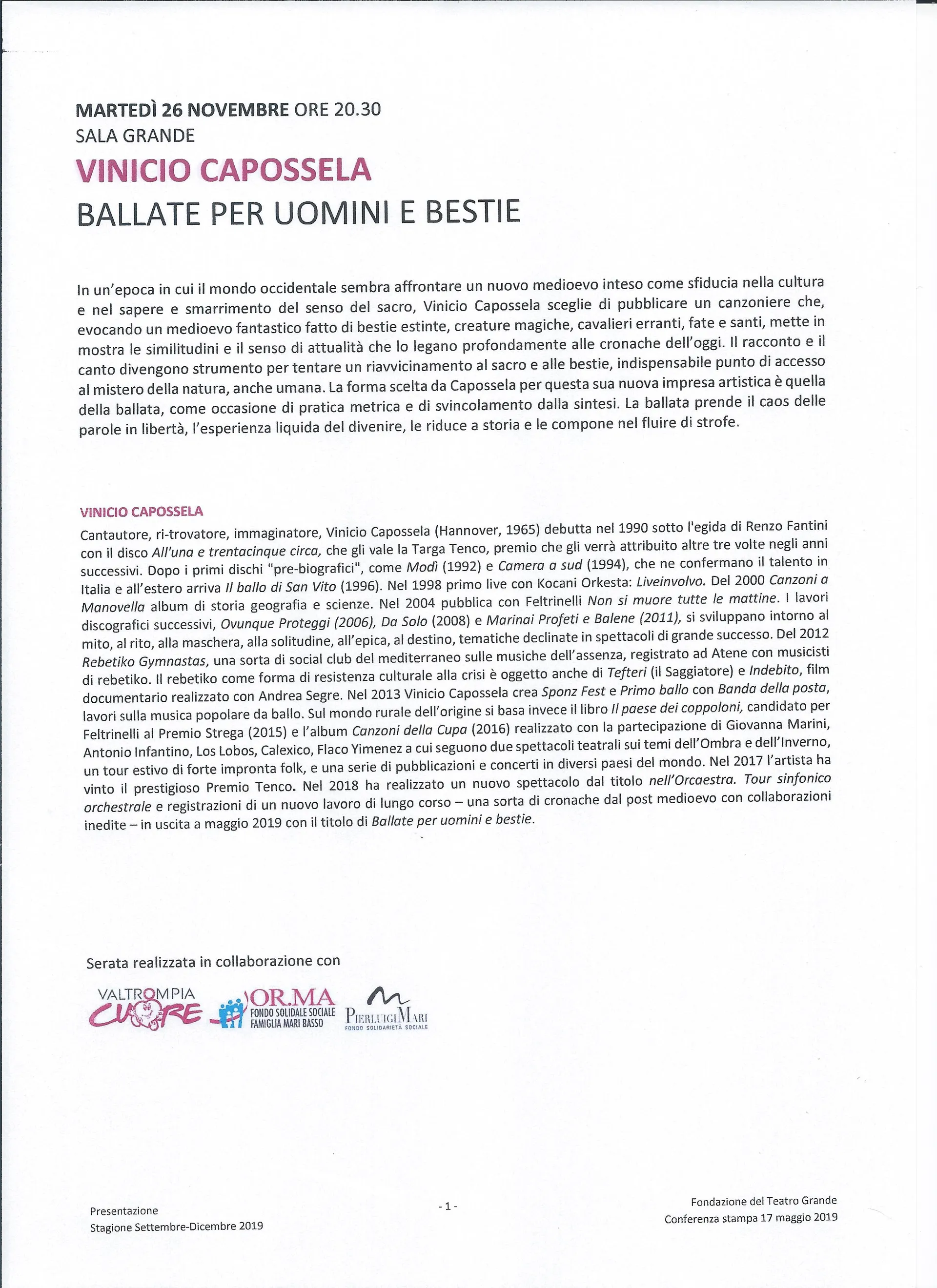 Un grande Vinicio Capossela protagonista a Brescia di Ballate per uomini e bestie, spettacolo appositamente studiato per un'ambientazione teatrale che ripercorre il suo ultimo lavoro discografico, vincitore della targa Tenco 2019. Qui Capossela mette in fila storia, letteratura, poesia, religione, filosofia e naturalmente la suggestione della musica, per proporre un'analisi disincantata della società d'oggi, sicuramente cruda ma sempre velata di poesia, una società che pare sprofondare in un nuovo oscuro medioevo, dove l'ignoranza si permette di sbeffeggiare e rinnegare la cultura e dove gli esseri umani paiono aver smarrito il senso del sacro.